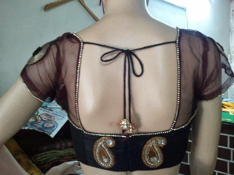 back neck with edge white running stone work in this blouse and netted half sleeve blouse.
